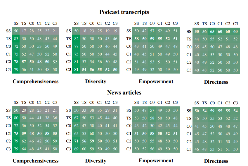 - 在新闻文章数据集上,全局方法的全面性胜率为 72%-80%(p<0.001),多样性胜率为 62%-71%(p<0.01)。