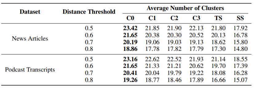 表 4:“平均聚类数量” 结果(即基于声明的多样性衡量指标)。