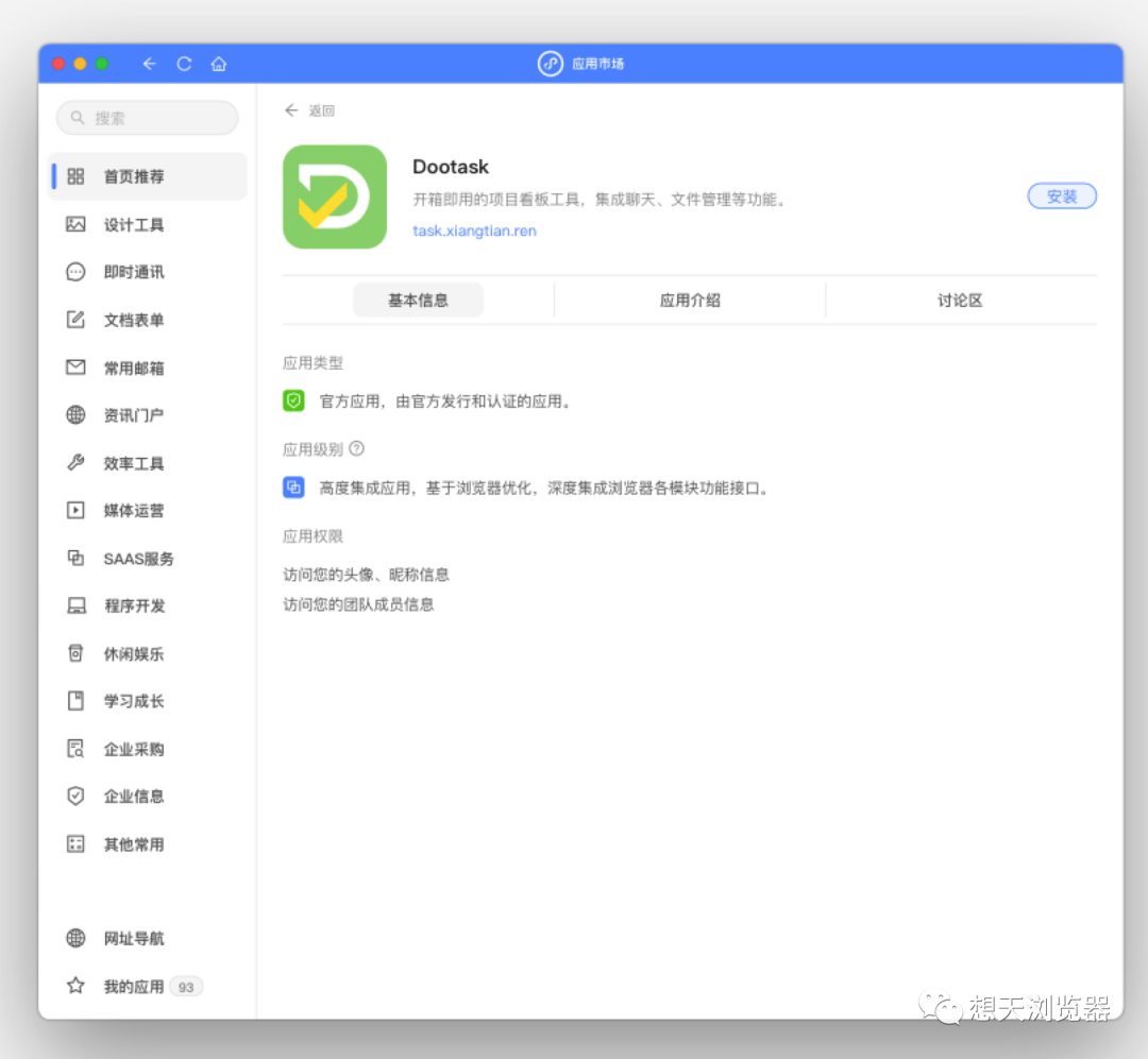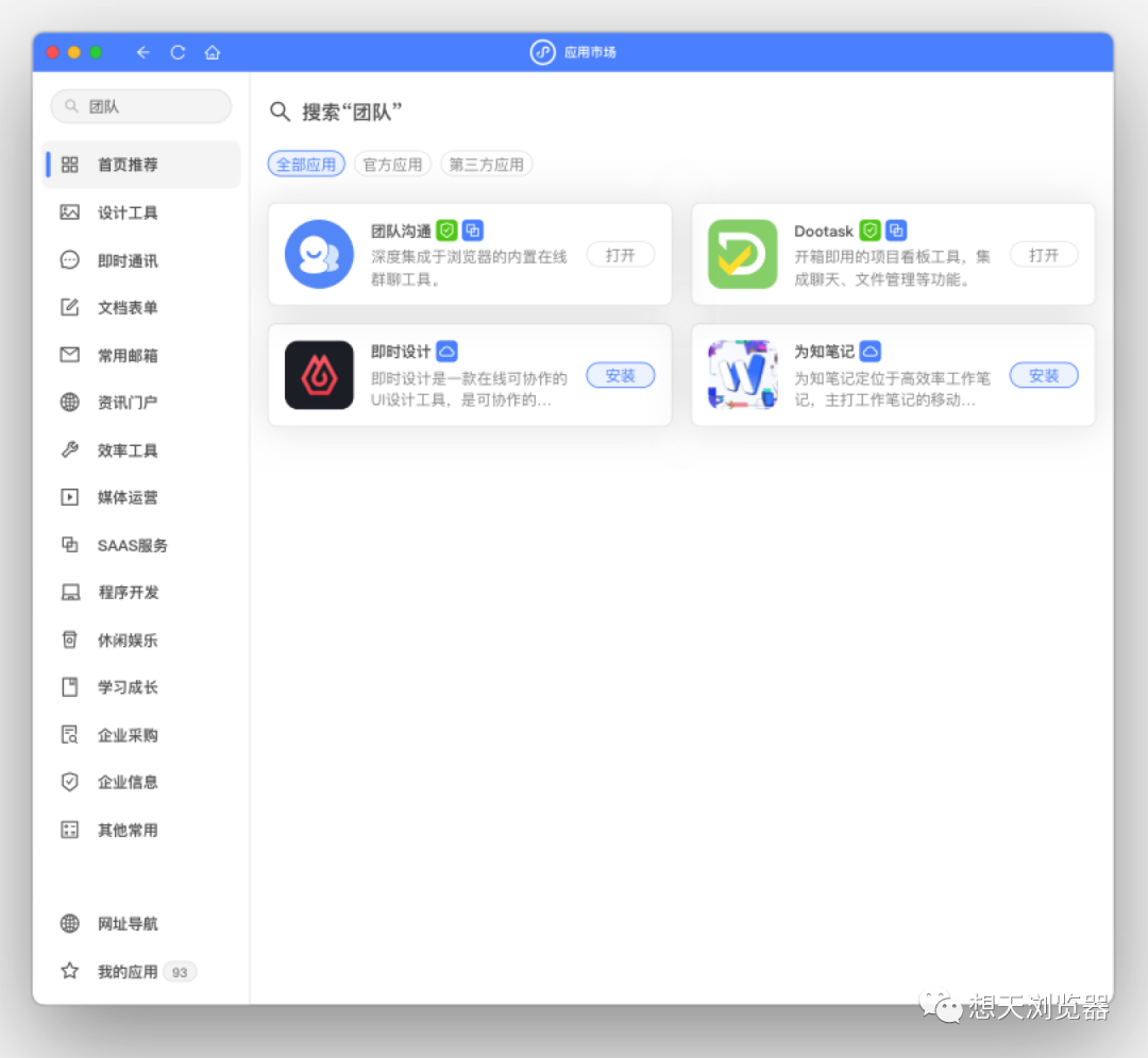 终于可以通过应用中心快速找到想天浏览器可用的应用了。