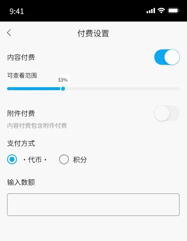 2.支持设置内容付费(帖子)、图片付费(动态)和附件付费(如内容中包含附件),内容付费主要为帖子正文,支持自由设置免费查看的比例,剩余部分需完成支付后方可查看。
