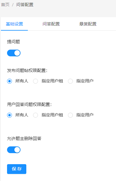 管理后台可配置问题的发布和回答权限,以及题主是否可以删除回答的权限。