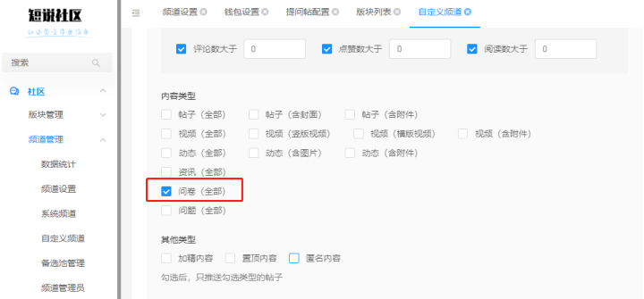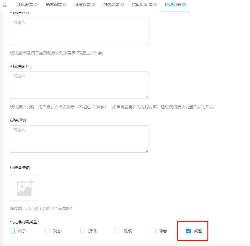 版块创建设置支持关联设置问答类型。