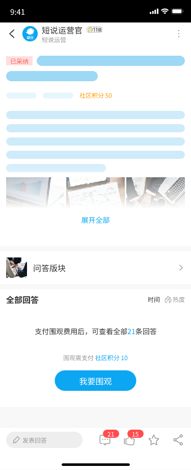 采纳答案后,该答案会被赋予“已采纳”的戳~ 同时题主拥有设置围观的权限,可设置围观的支付类型和分值。
