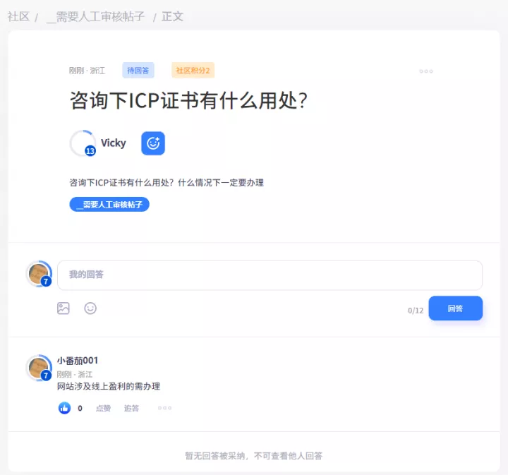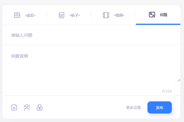 支持用户前台发布问题帖,问题帖标题(必填)、说明(选填)、支持添加图片、选择版块(可不选)、支持增加悬赏奖励、支持匿名发布。问题无回答时支持再次编辑问题。