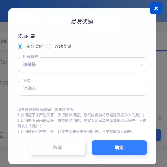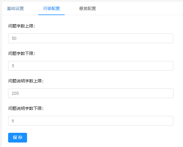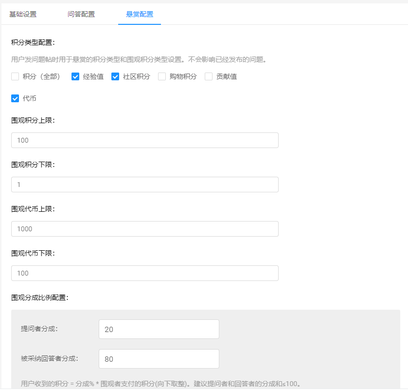 管理后台可配置问题的字数限制、悬赏奖励类型、围观费用分配比例及限制。