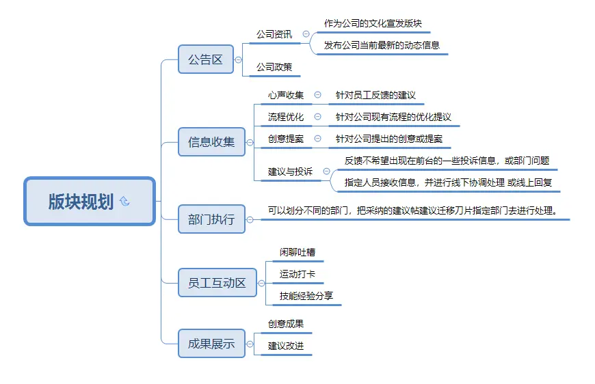 下图是我对企业内部社区的版块规划设想,是以短说论坛产品的功能为原型,方案可供参考。
