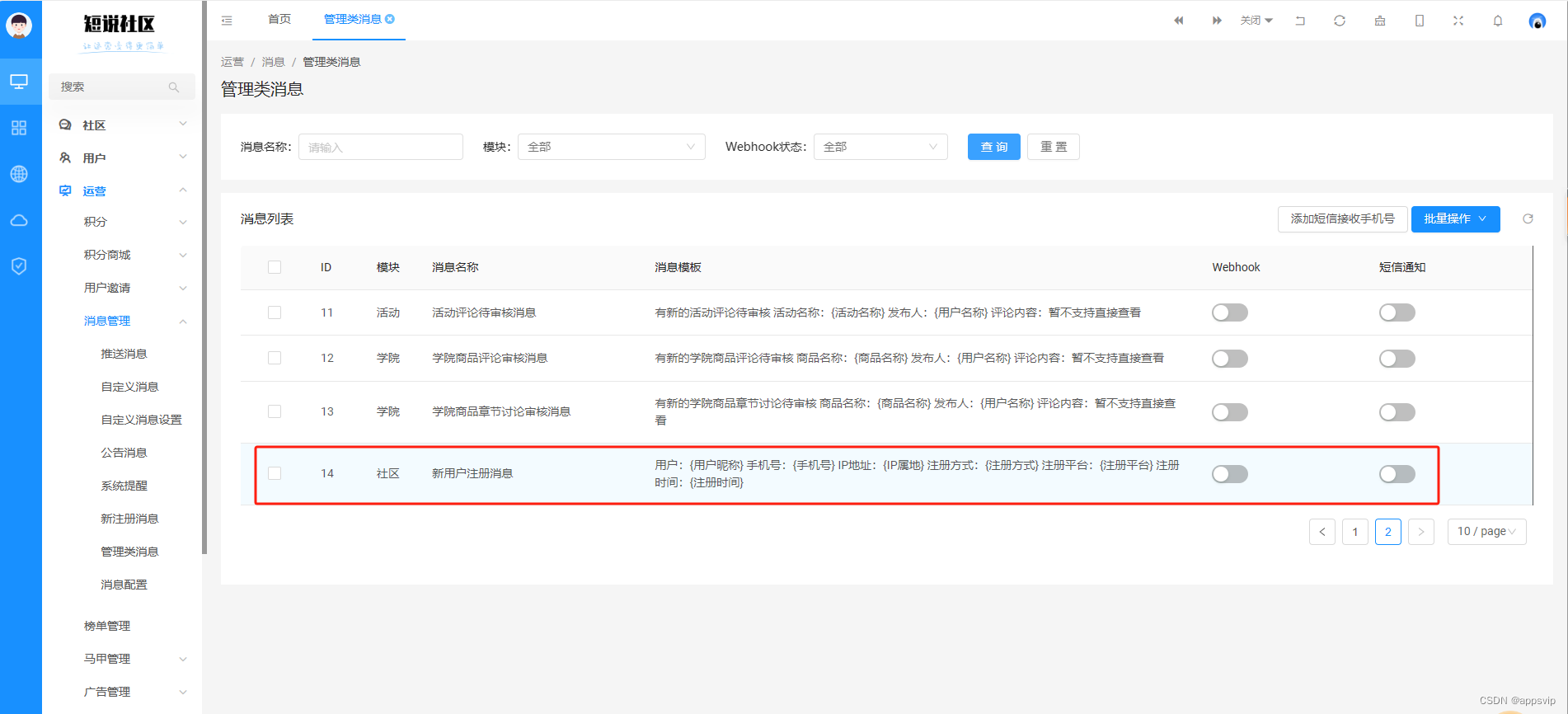 02:后台管理类消息新增新用户注册消息支持webhook消息推送。使用场景:当网站有新用户注册时,网站运营人员可通过webhook消息推送快速获知。
