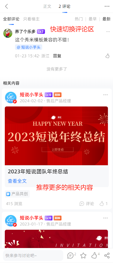 用户在帖子详情列表,能否快速的切换到评论信息,能否查看相关类型帖子的推荐,这些都是有助于用户停留在社区的细节功能。