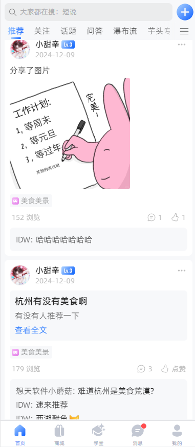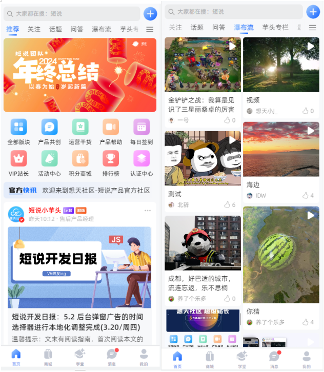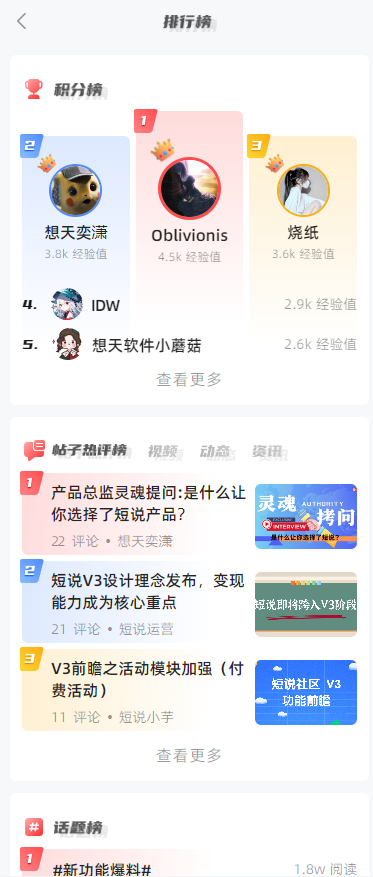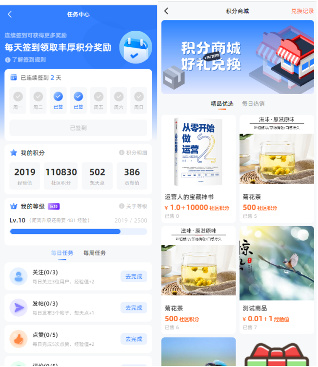 积分系统:用户通过发帖、评论、分享等行为获取积分,在积分商城进行奖励兑换。
