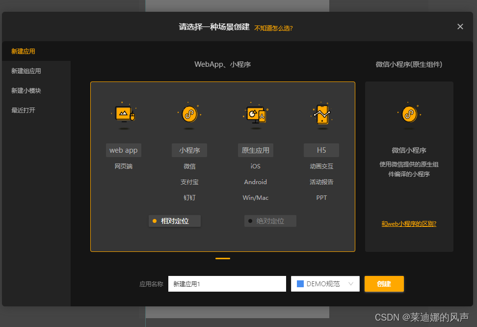 我主要是使用IVX来开发前端页面,再新建应用中,我们可以看到多个选项,比如web app,网页端,以及小程序 和 windows android 原生应用,包括H5页面。