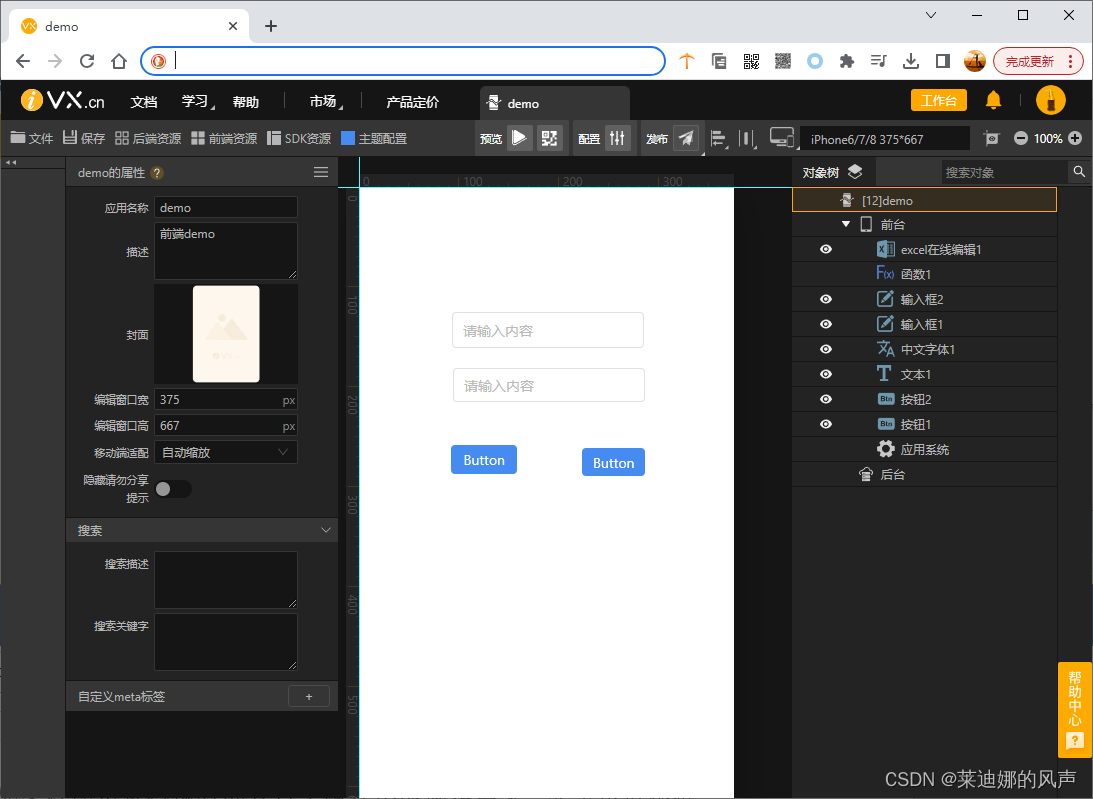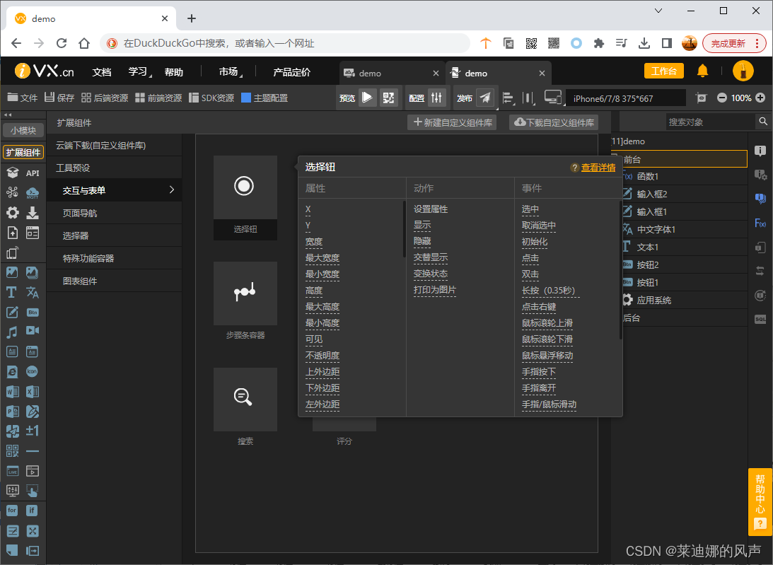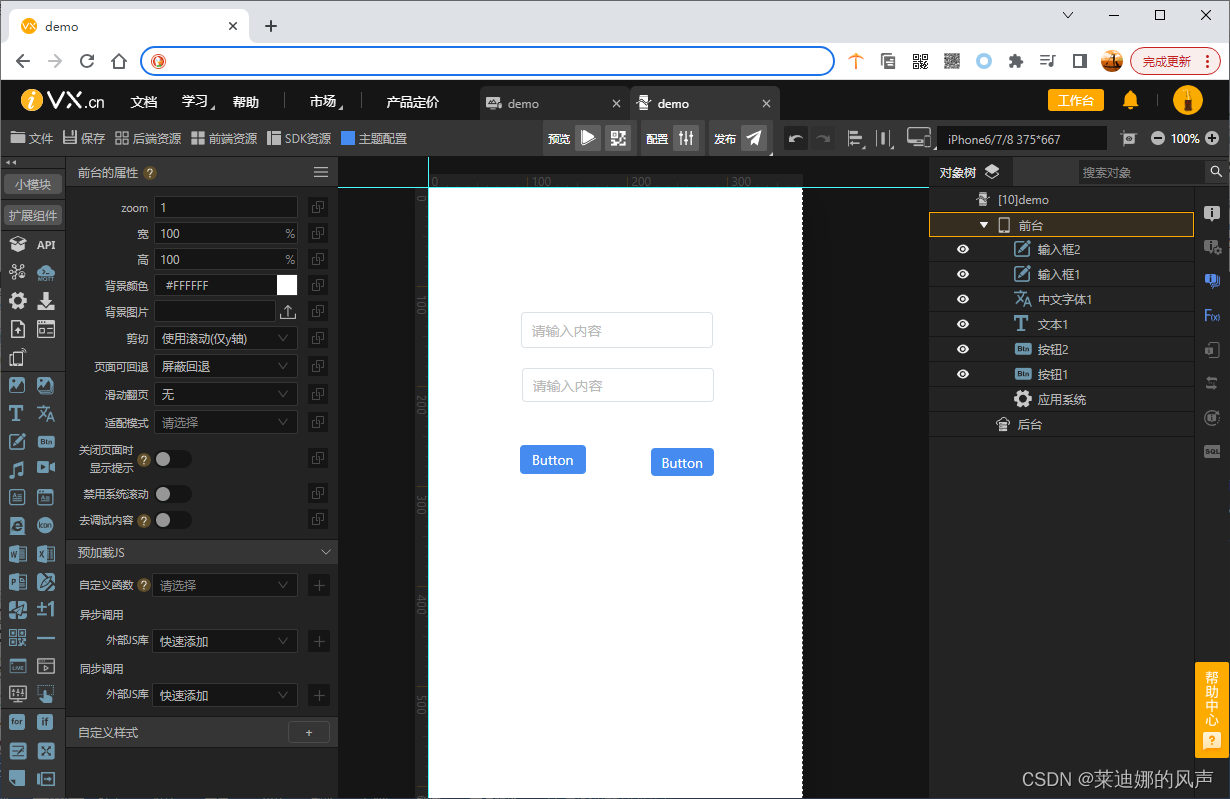 ivx是支持使用界面拖拽来完成我们想要的界面的,看看下图就知道了,我使用的绝对布局,制作了两个按钮,两个文本编辑框。当然这是测试,我使用的是比较基础的功能,ivx远不止于此。我现在在ivx这个界面拖拽生成的所有内容,都可以在后续直接导出来。这可以说是大幅减少了我这个后台人员的心智。在前端这一块儿,我可以不用费太多心思就做出我想要的效果,大幅减少了在前端的工作量。