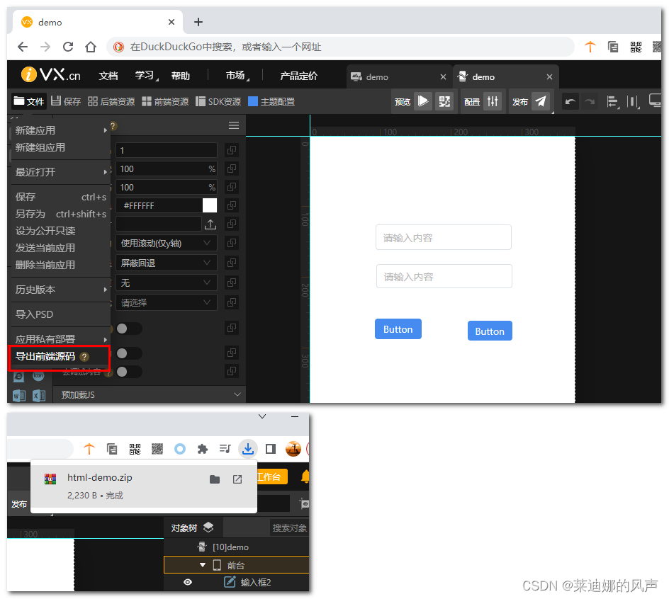 在我们将想要做的工作做好之后,我们可以点击左上角的文件,然后选择菜单的最后一个选项,即 导出前端源码。这是最为关键的一个步骤,之后浏览器会自动下载一个压缩包,压缩包内就是我们需要的源码。