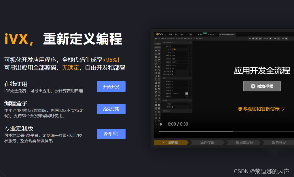 于是我专门搜索了一下。发现iVX刚好满足我的这个需求,iVX官网对它的介绍是一款低代码开发平台,我在了解之后,感觉更像是一个代码生成工具,我个人主要拿它来生成前端代码使用。先来看看官网对于低代码的介绍。