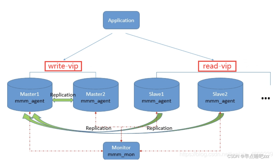 是一套支持双主故障切换和双主日常管理的脚本程序。MMM使用Perl 语言开发,主要用来监控和管理MySQL Master-Master(双主)复制,虽然叫做双主复制,但是业务上同一时刻只允许对一个主进行写入,另一台备选主上提供部分读服务,以加速在主主切换时备选主的预热,可以说MMM这套脚本程序一方面实现了故障切换的功能,另一方面其内部附加的工具脚本也可以实现多个Slave的read负载均衡。