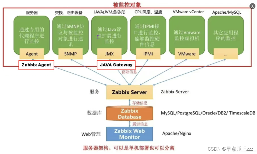- zabbix agent 需要安装在被监视的目标服务器上,它主要完成对硬件信息或与操作系统有关的内存,CPU 等信息的收集