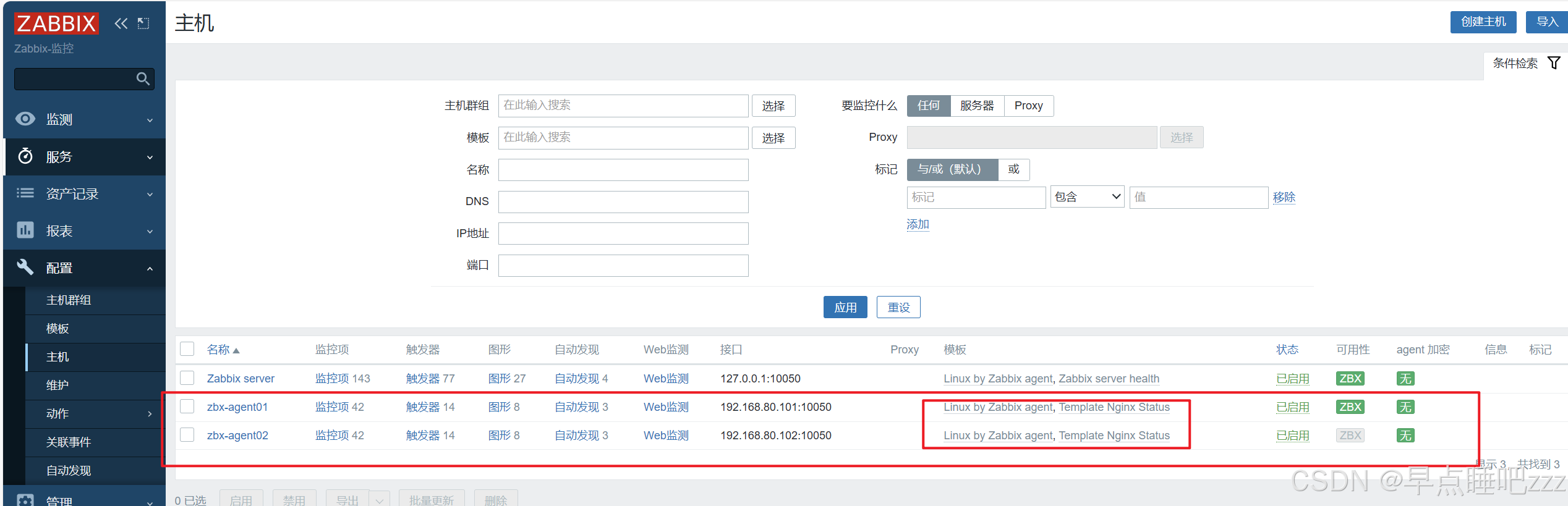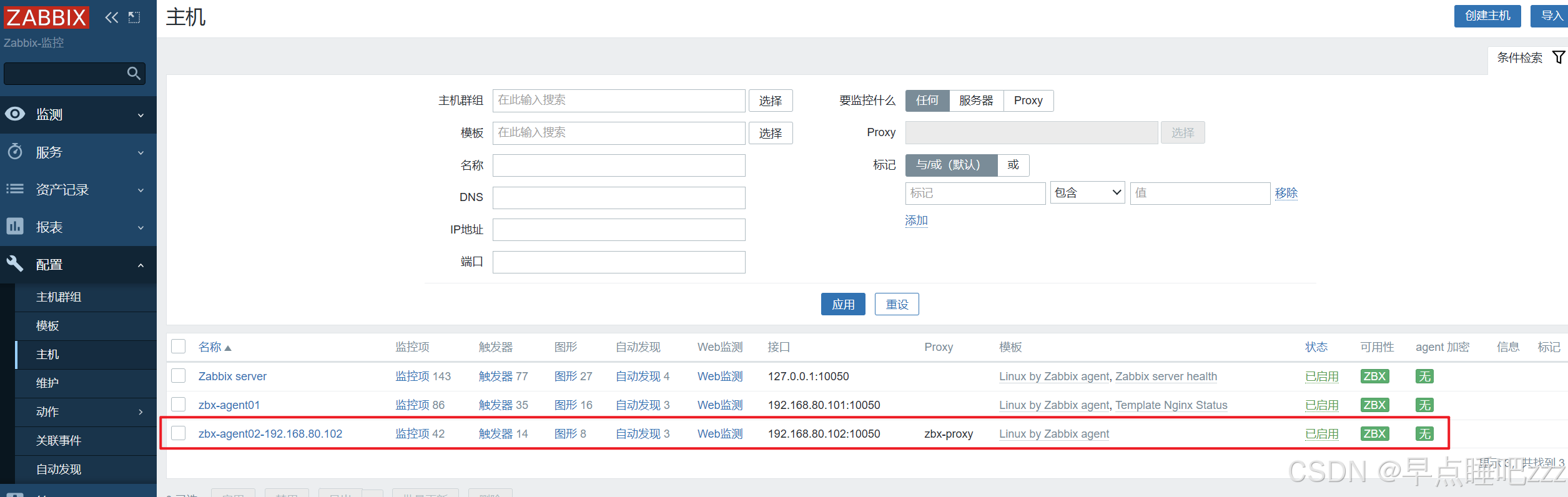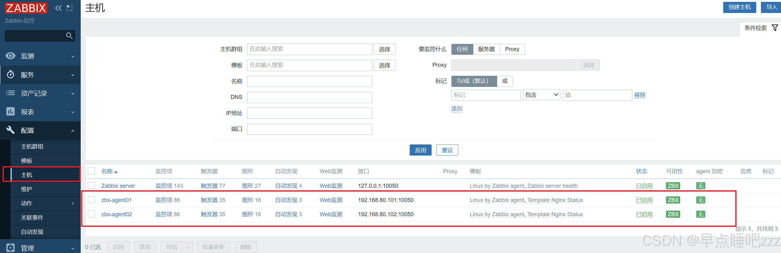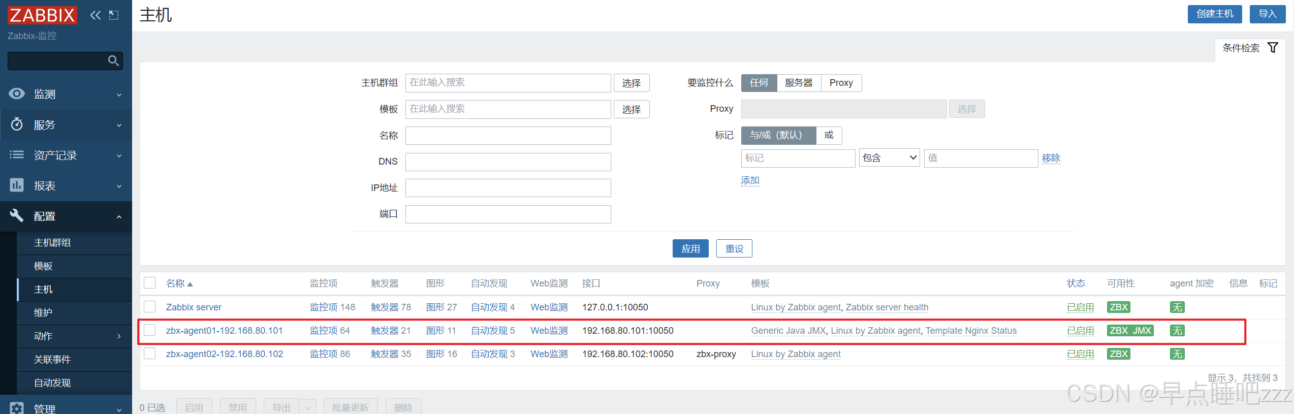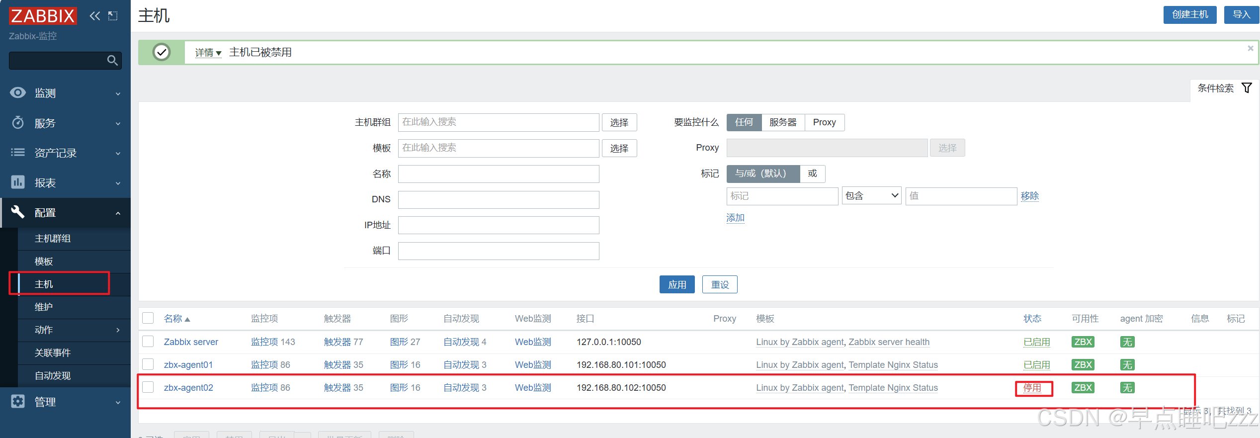 点击左边菜单栏【配置】中的【主机】,点击 zbx-agent01