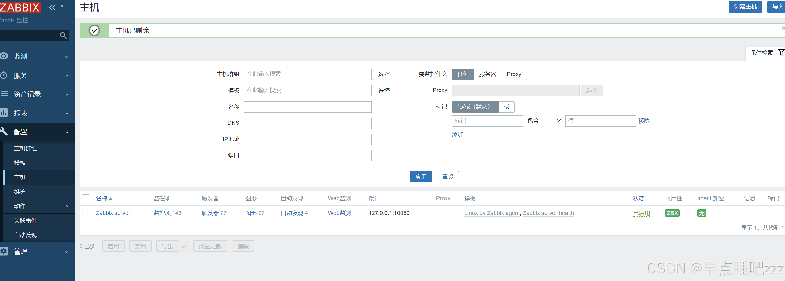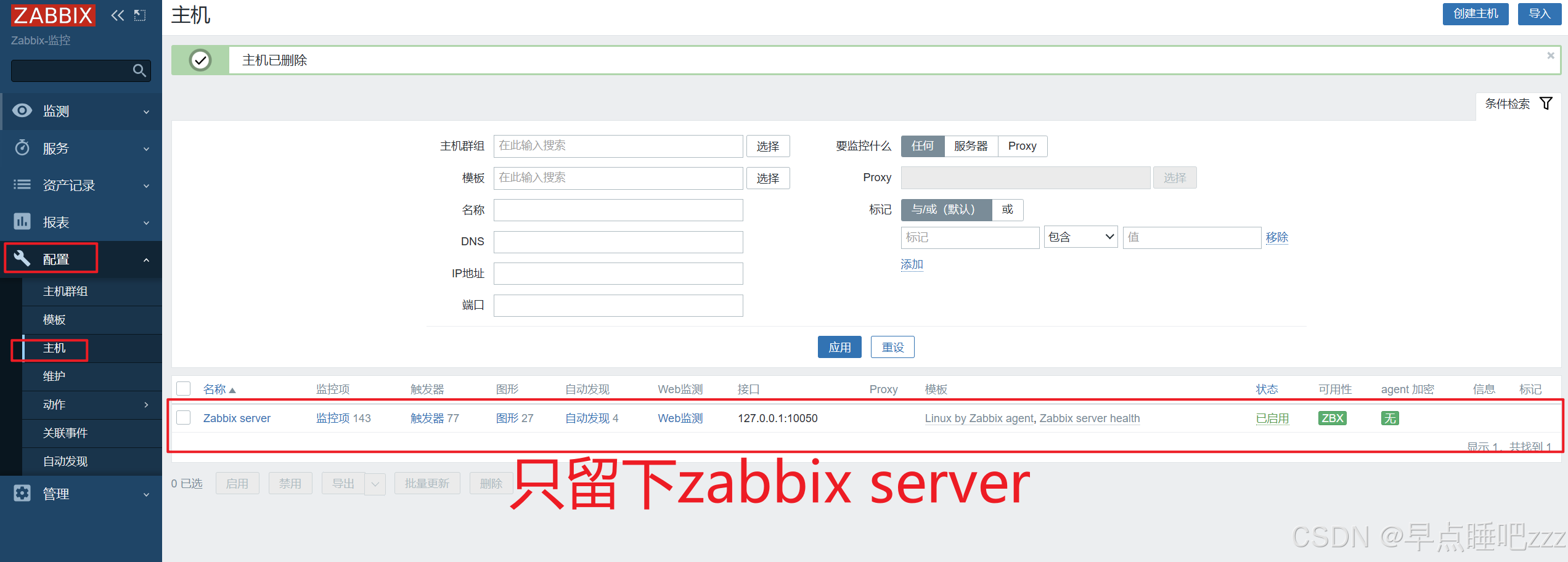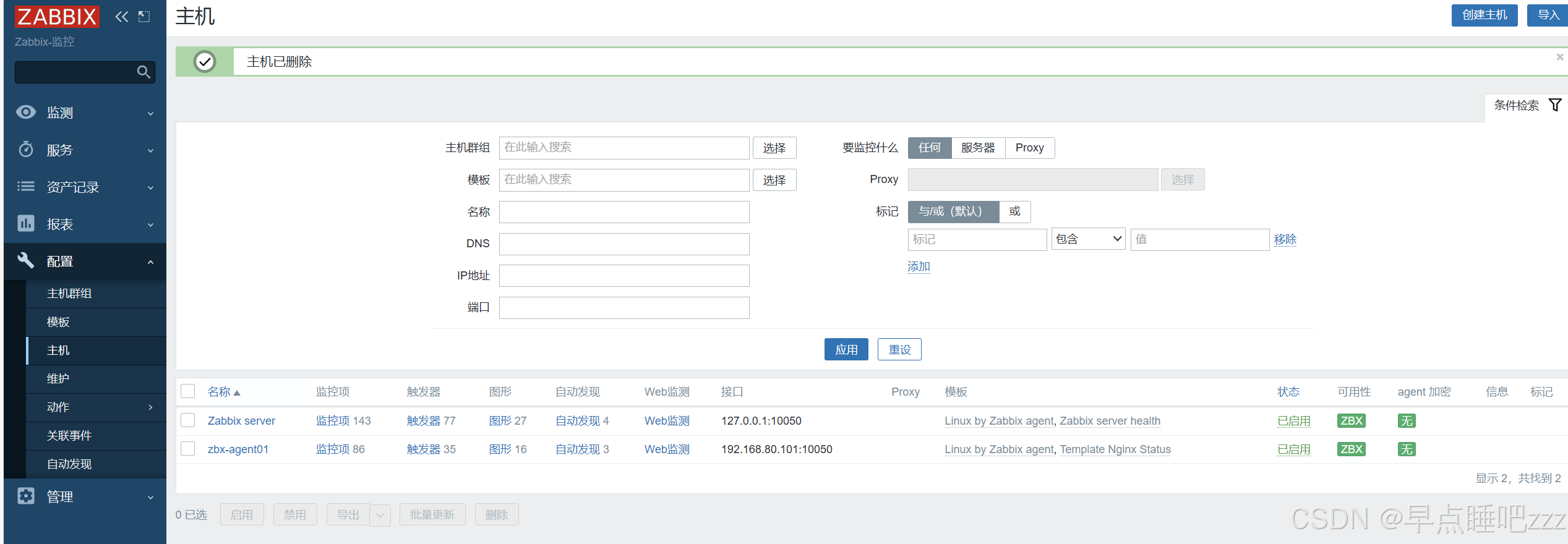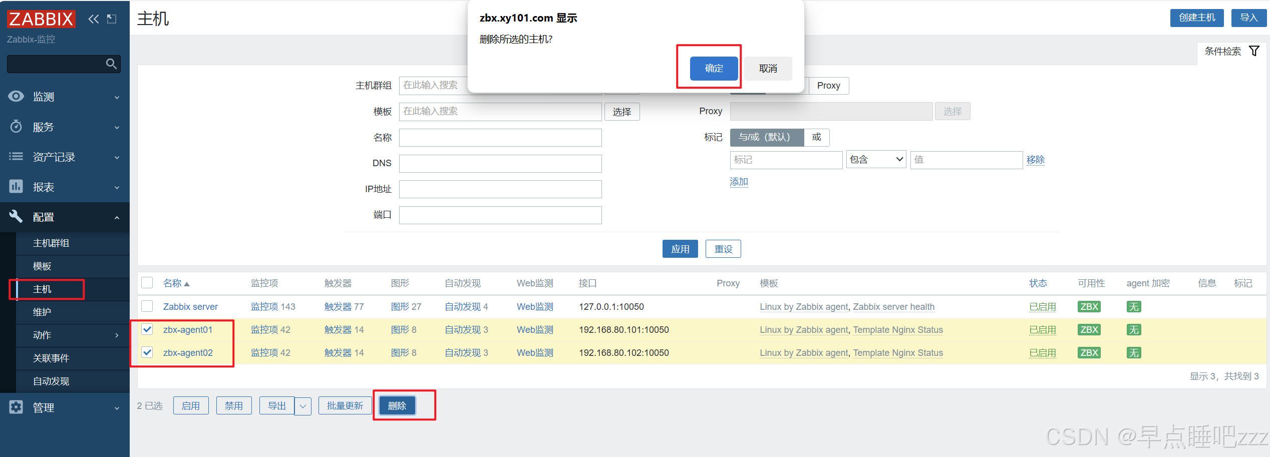 点击左边菜单栏【配置】中的【主机】,勾选原有的客户端主机,点击 删除