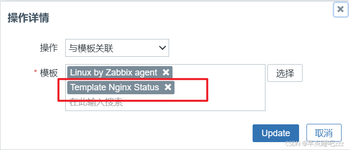 再点击【添加】,【操作类型】选择 与模板关联,【模板】搜索 Linux,选择 Linux by Zabbix agent,搜索Nginx,选择Template Nginx Status点击 【Add】