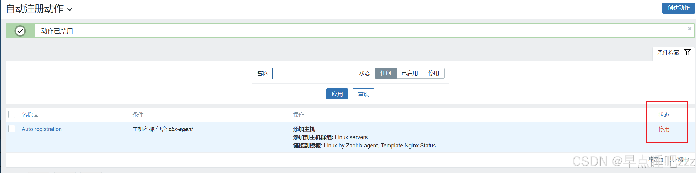 点击左边菜单栏【配置】中的【动作】,勾选自动注册规则,点击 禁用