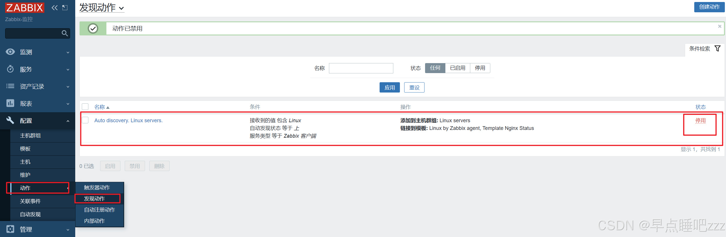 勾选 【已启用】,点击 【添加】点击左边菜单栏【配置】中的【动作】,上方菜单选择 【发现动作】