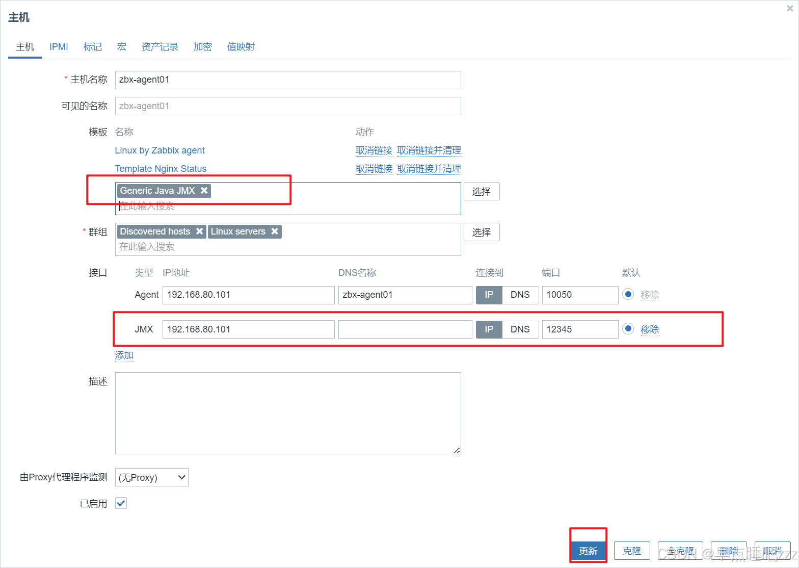 勾选 【Auto discovery. Linux servers.】,点击 【启用】点击【Auto discovery. Linux servers.】进入点击上方【操作2】模板添加【Template Nginx Status】点击【update】点击【更新】