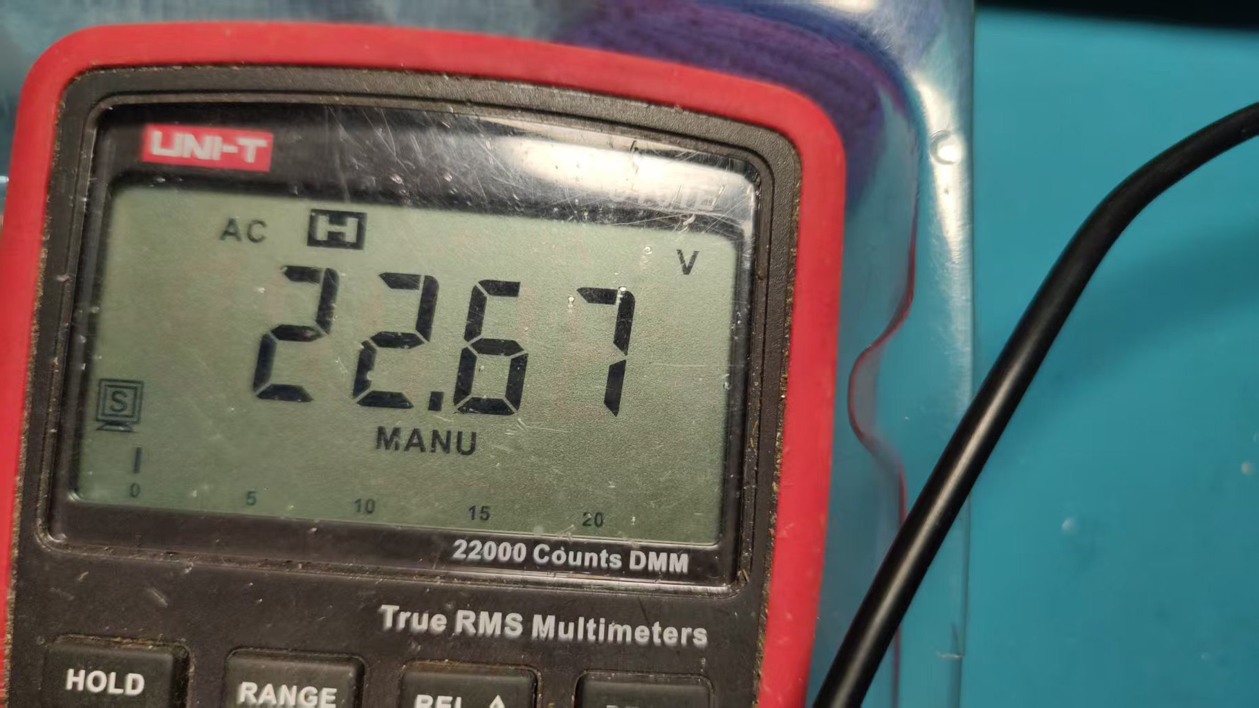 结果想起来一个事,心里感觉不太好,就真的用万用表测量了一下音响的音频接头,对地线的电压,果然很高:AC22.67V.