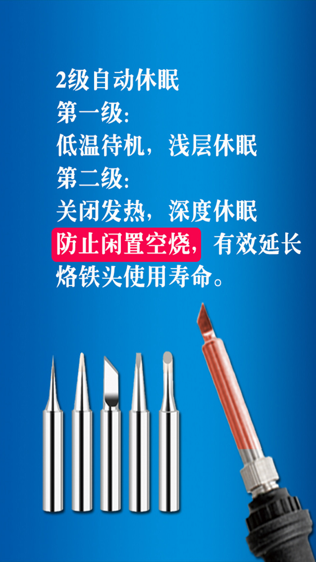 2级智能休眠:短时离开自动低温待机,长时间闲置则彻底关闭发热,有效避免烙铁头“空烧”氧化,延长寿命。