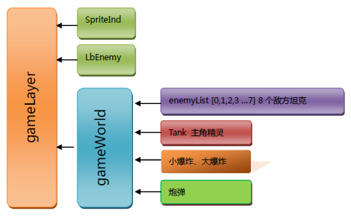至此,一个简单的坦克大战演示就初步完成了。为了给大家一个更形象的认识,上一张层结构示意图。