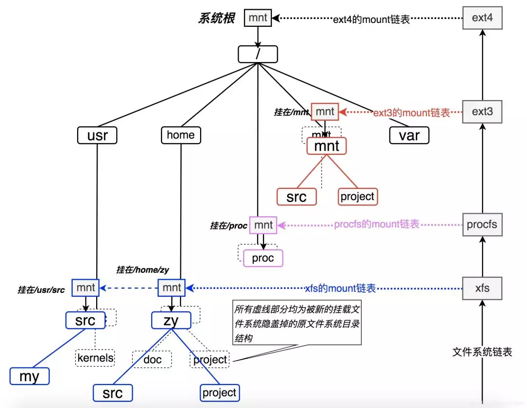 如果我们把本文最初描述的那个在几乎所有UNIX/类UNIX系统中长的一模一样的文件系统表面刨开,在Linux内核中,文初的那棵树其实它长下面的样子(其实在大多数类UNIX系统中,它们长得都差不多):