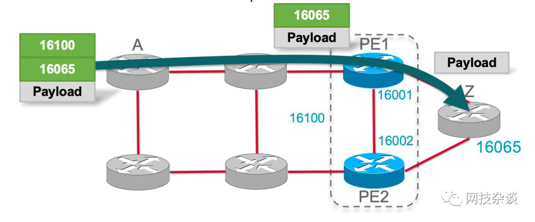 - PE1 and PE2 都通告了一个 Anycast prefix-SID,16100