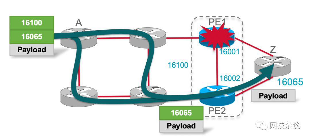 - 当PE1出现故障时,自动re-route,流量通过PE2转发