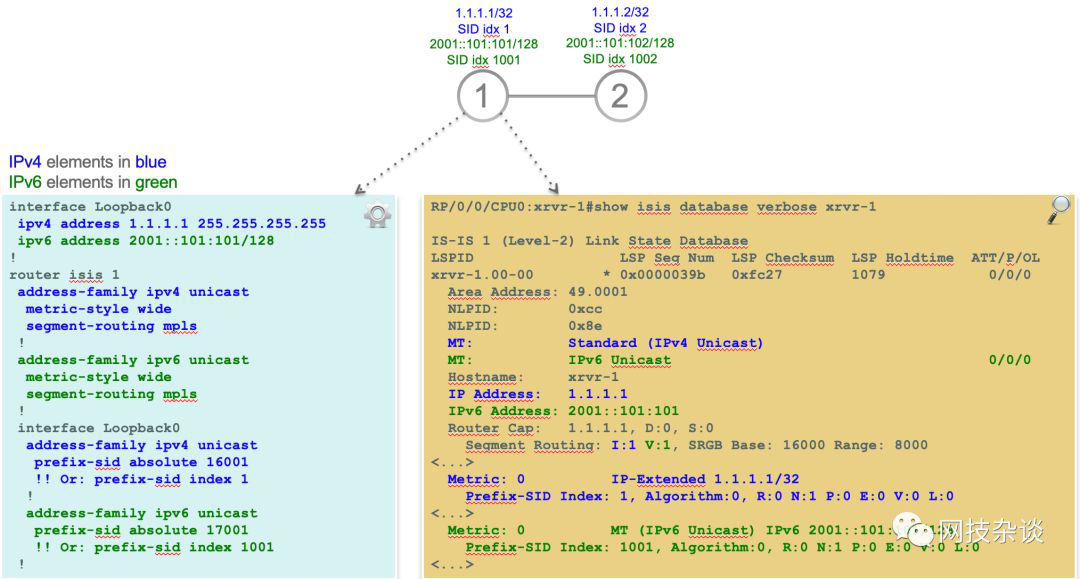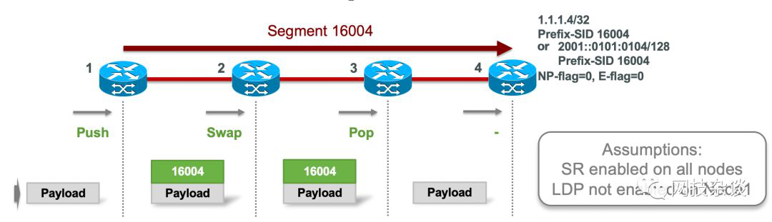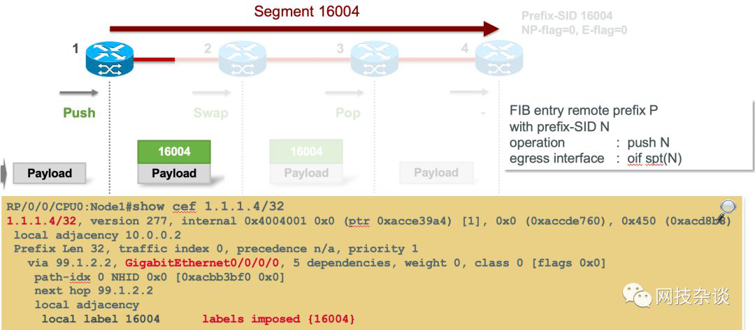 - Node-4 通告了它的loopback接口的IPv4前缀:1.1.1.4/32,prefix-SID:16004. (或者Node-4通告ipv6前缀2001::0101:0104/128,prefix-SID:16004)