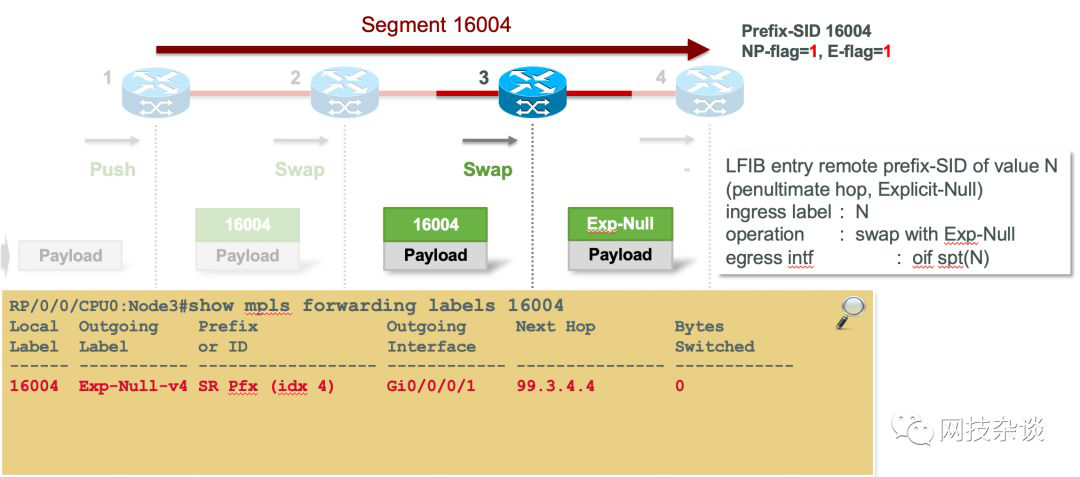 这里Node-4通过的loopback接口前缀“NP-flag=1,E-flag=1”,即:禁用PHP,启用Explicit-Null。这里Node-3将与上一个例子中的动作不同:从Node-3的LFIB输出可见:Outgoing Label变成了“Exp-Null-v4”。如果是IPv6,这里就会显示成“Exp-Null-v6”