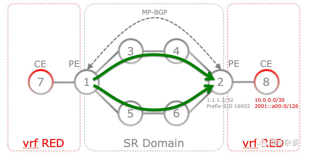 - Red VRF中的CE(Node-8)通告前缀10.0.0.0/30