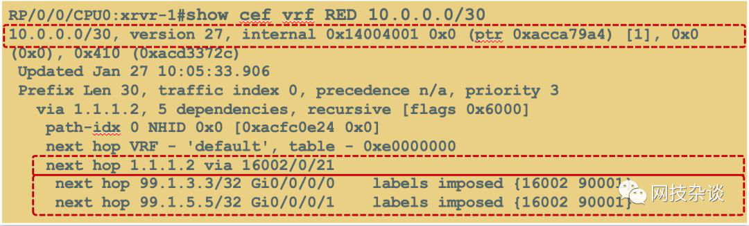 - Node-1上查看RED vrf中的10.0.0.0/30 FIB: