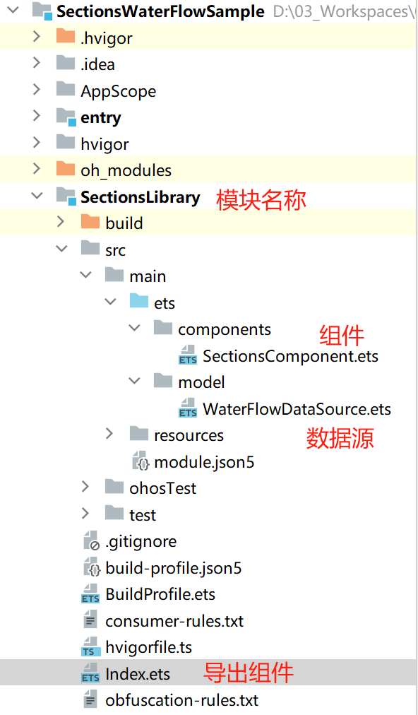 在SectionsComponent模块根目录下Index.ets文件,导出模块组件,提供给外部使用