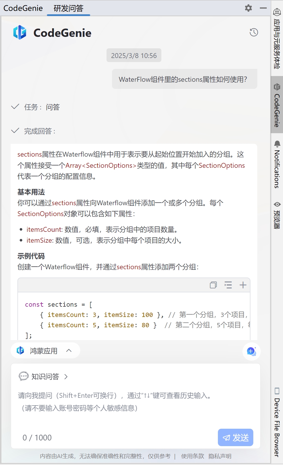 通过使用@Reusable 装饰器标记复用组件,结合LazyForEach懒加载,丝滑感觉就出来了,想尝试这丝滑感觉的,可以在源码仓库或附件里下载源代码体验一下,本项目创建时选择的API13,可以通过本地模拟器上运行体验,开发这个Sample时,使用的开发工具是DevEco Studio 5.0.3 Beta2,里面集成了DeepSeek,大家也可以下载最新版本体验一下。