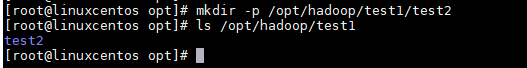 使用命令:mkdir -p /opt/hadoop/test1/test2