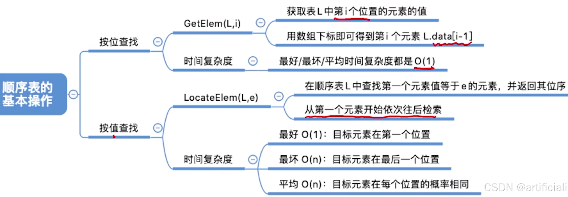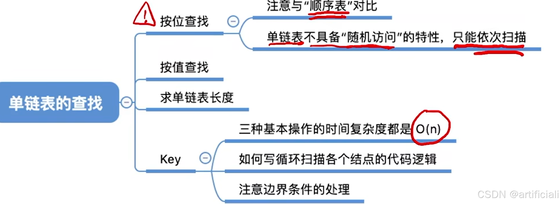 | 查找操作 | 按位查找:O(1),按值查找:O(n);若有序则为O(log2n) | 按位查找:O(n),按值查找:O(n) |