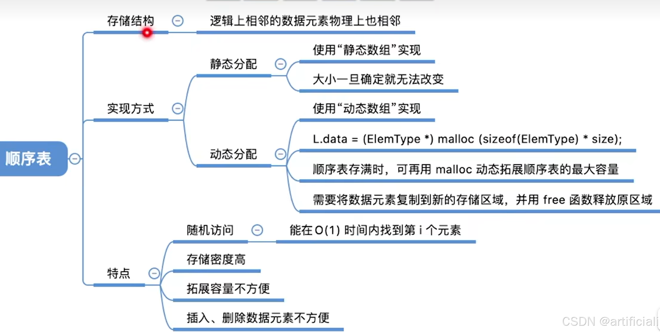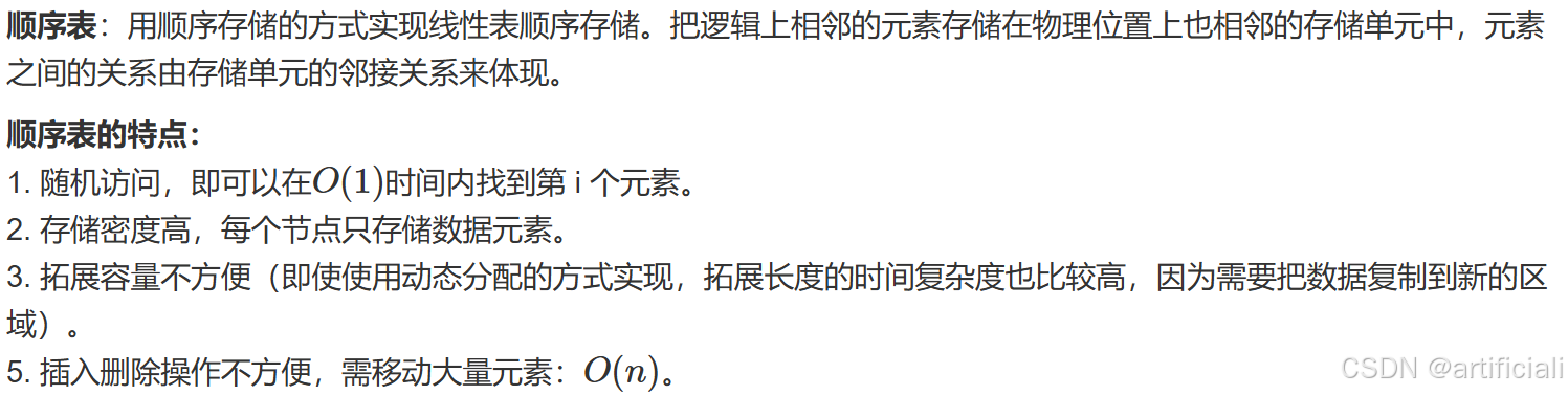 - 顺序存储的固有特点:逻辑顺序与物理顺序一直,本质上是用数组存储线性表的各个元素(即随机存取);存储密度大,存储空间利用率高。