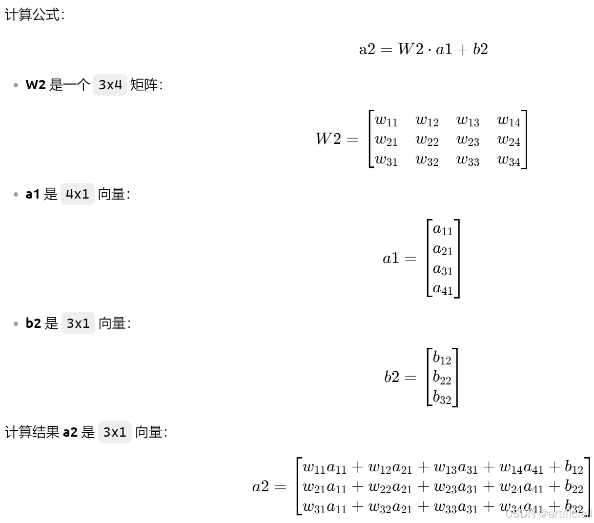 3x4(每个第一个隐藏层节点连接到每个第二个隐藏层节点)。 - 偏置向量 b2 的维度为