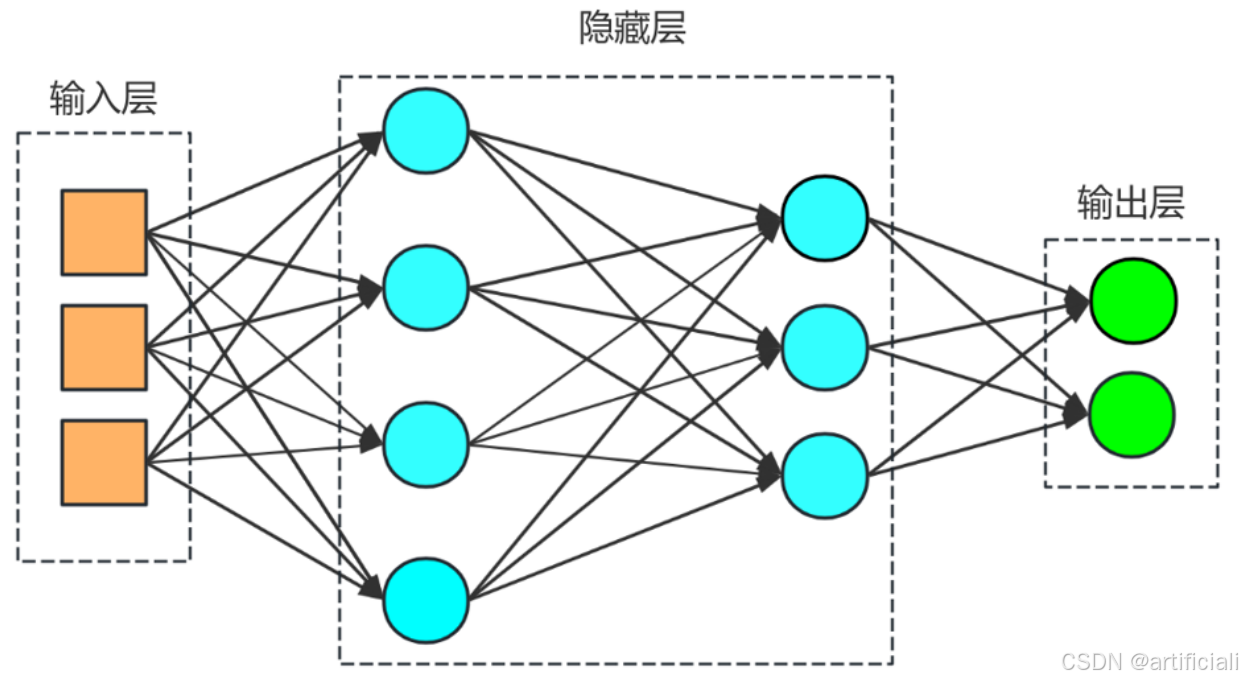 假设输入层有3个节点,隐藏层分别是4个和3个节点,输出层有2个节点。为了简便表示我们忽略激活函数。