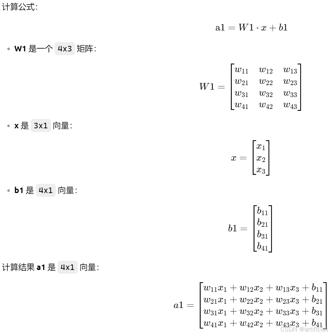 4x3(每个输入节点连接到每个隐藏节点)。 - 偏置向量 b1 的维度为