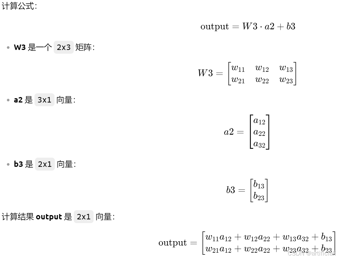 2x3(每个第二个隐藏层节点连接到每个输出节点)。 - 偏置向量 b3 的维度为