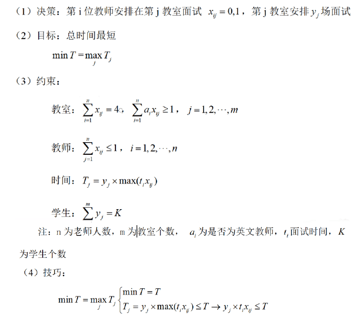 一场面试的实际时长由该场面试中4位教师影响时长的最大值决定