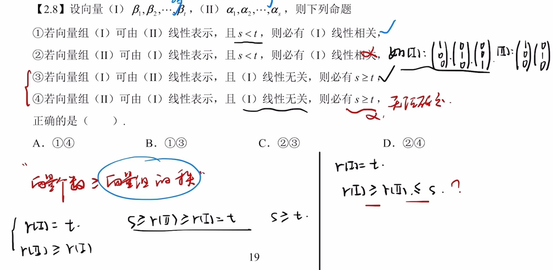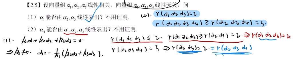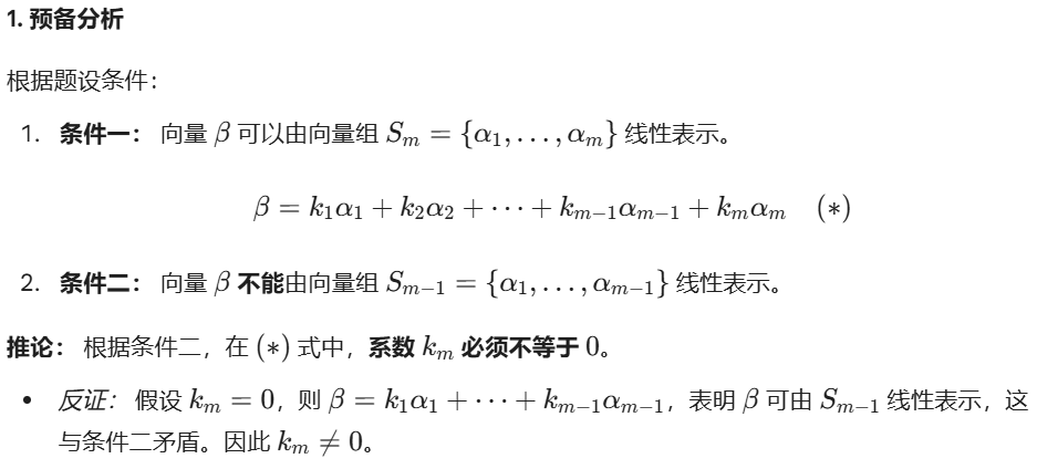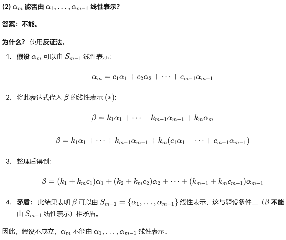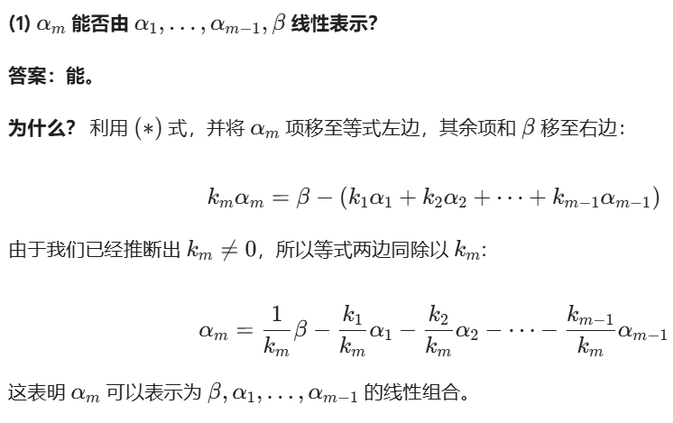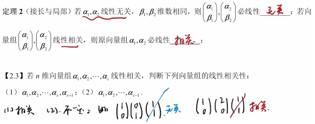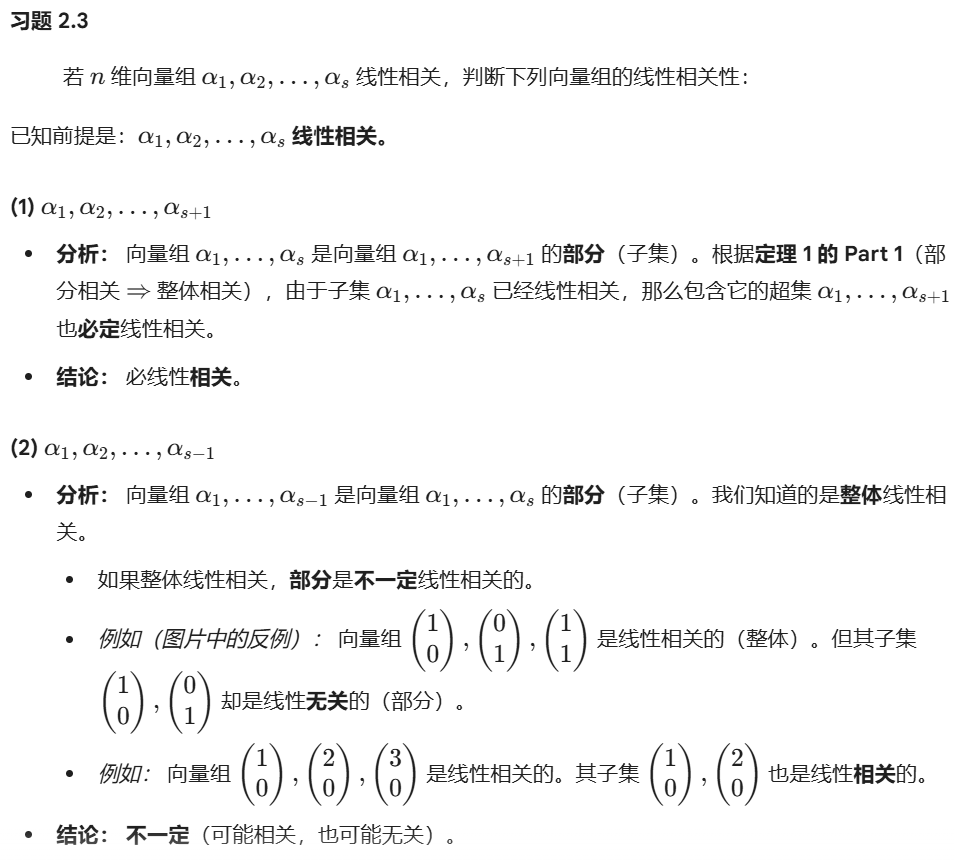 解释: 如果一个向量组的部分(子集)已经线性相关了,意味着子集中的某个向量可以被子集中的其他向量表示。将这个子集放入一个更大的整体(超集)后,这个表示关系依然成立,所以整个超集当然也是线性相关的。