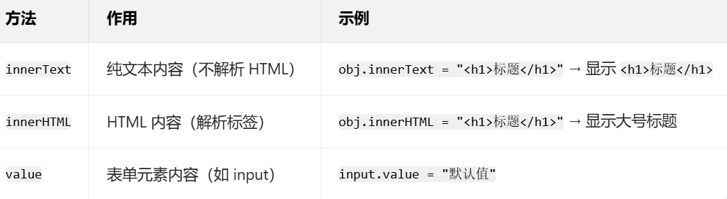 obj.innerHTML = "<span style='color:red'>带样式的文本</span>"; // 显示红色文本