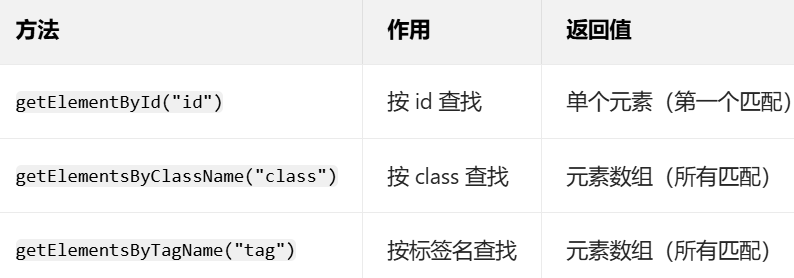 querySelector("选择器"):返回第一个匹配元素querySelectorAll("选择器"):返回所有匹配元素(数组)