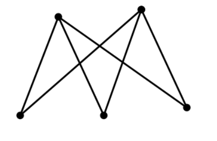 完全偶图:完全偶图是指具有二分类 ( X , Y ) (X, Y) (X,Y)的简单偶图,其中X的每个顶点与Y的每个顶点相连,若|X|=m,|Y|=n,则这样的偶图记为 K m , n K_{m,n} Km,n,下图为 K 2 , 3 K_{2,3} K2,3: