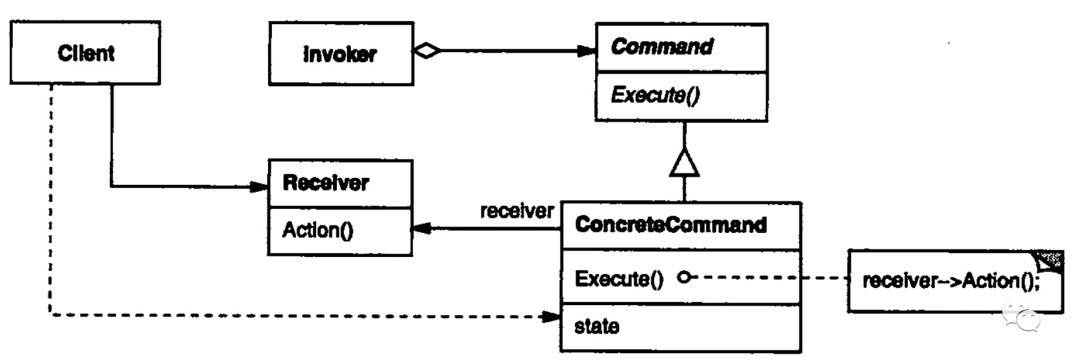ConcreteCommand 是命令接口的实现,它会注入具体执行者 Receiver,它实现的 execute 方法会调用 receiver.execute 来具体执行。